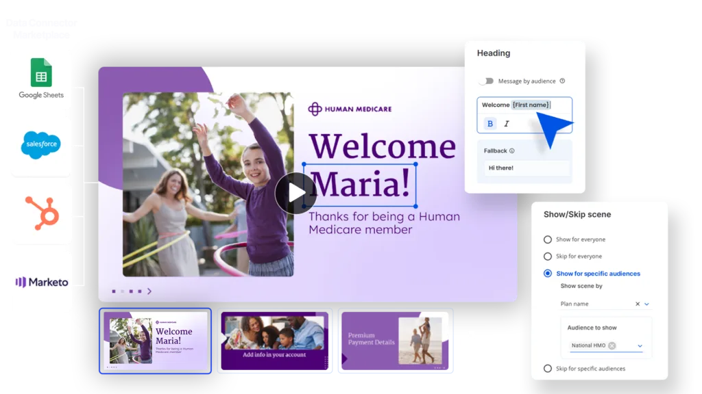 Personalizing a video with a viewer’s first name? That’s just the beginning. Now you can seamlessly infuse videos with any data point about an individual: dates, balances, order details, locations, account information, and more.