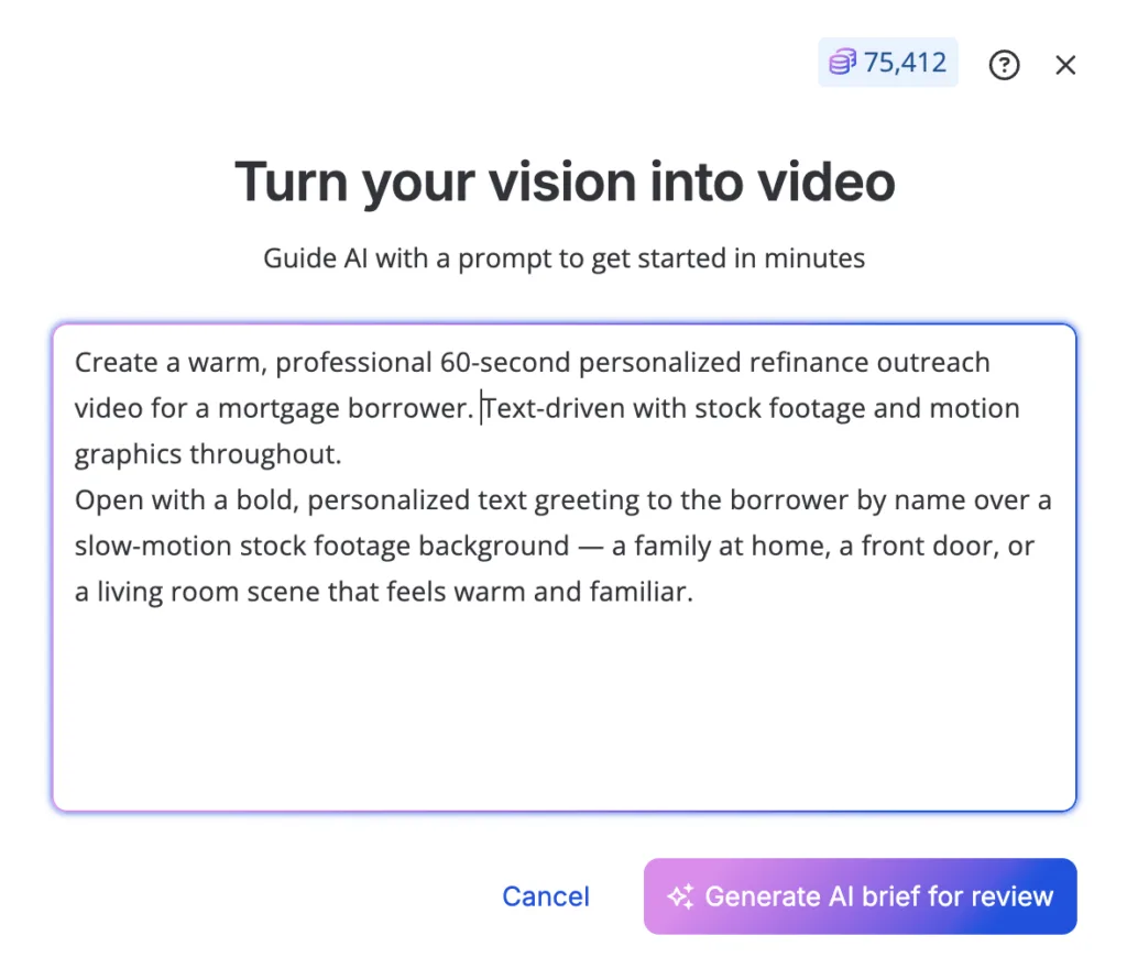 Create memorable mortgage and loan videos in minutes – not weeks – with engaging, AI-enriched content that drive action and results.