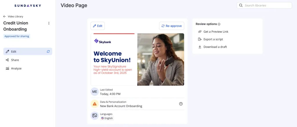 SundaySky is the enterprise video personalization platform trusted by leading credit unions. See how personalized video and AI transforms member engagement, increases loyalty, and drives 2-3x higher offer response rates.